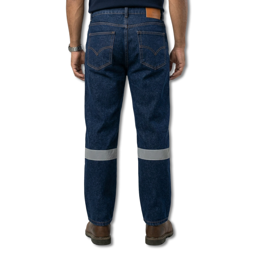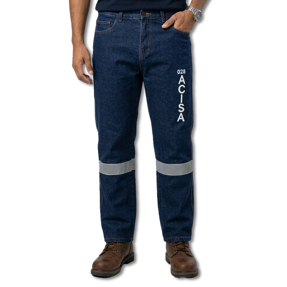 Pantalón de trabajo industrial en denim o jeans, resistente y cómodo, con cinta reflectiva y acabados de alta calidad para uso operativo.